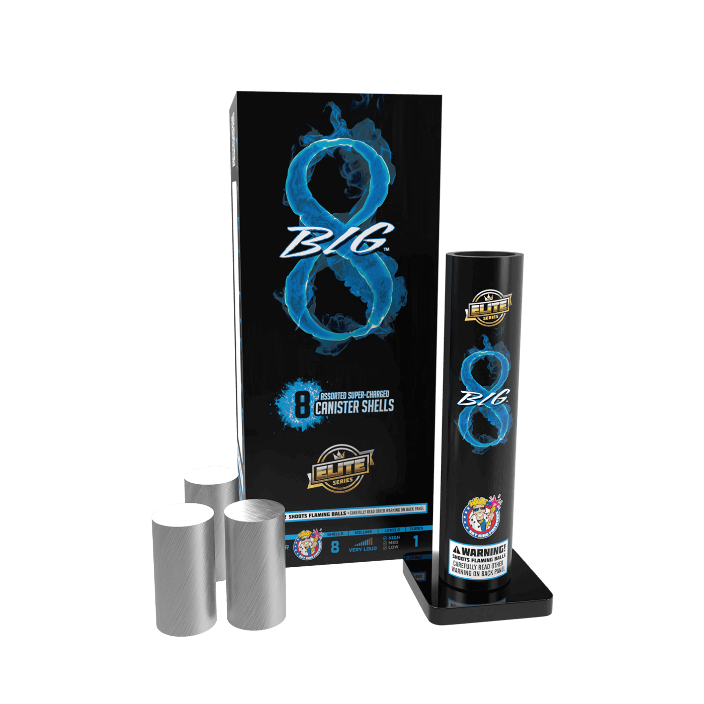 8 canister shells featuring the most exquisite colors on the market including: turquoise and purple with golden glitter; green and purple with golden glitter; purple, red and blue with green glitter; turquoise, orange and yellow with white glitter; blue wave with blue glitter; gold crown with red glitter; lemon yellow with crackling flowers; red glitter, white glitter with blue stars. These effects alone are worth the price not to mention the ear pounding reports this shell will deliver.