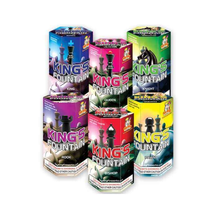 Fountain: Blue and yellow stars with red strobes. Blue flame to Iron flowers. Red, white and blue stars with strobes. Gold Crackling